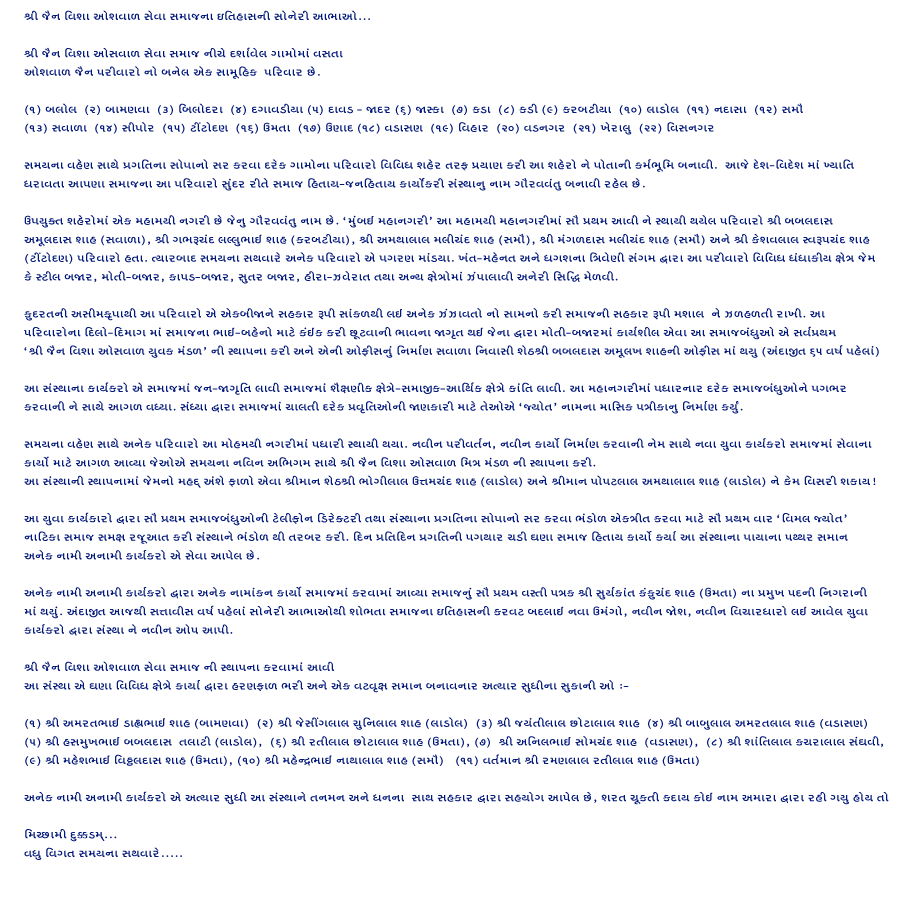 Shri Jain Visha Oswal Seva Samaj is an association of families belonging to the following towns
